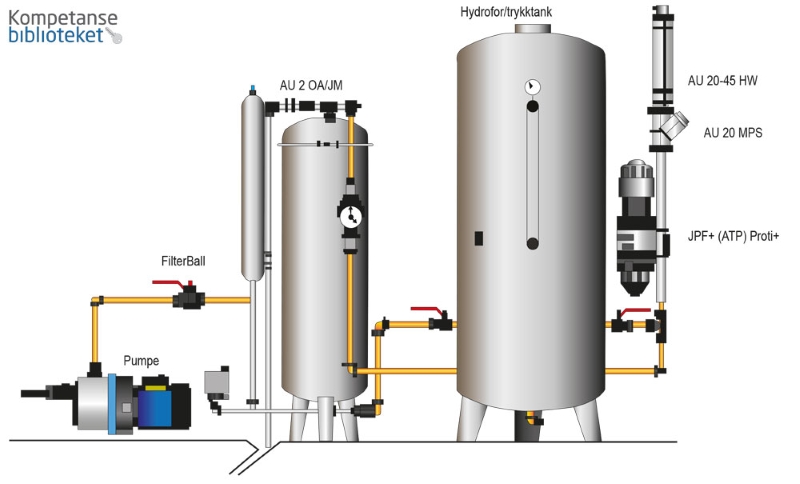 Figur 1. Eksempel 1: Monteringsskisse på en komplett løsning for problemer med jern/mangan, partikler, lukt/smak og kalk: (tegnes om, nye skisser).