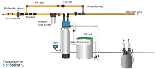 Figur 2. Eksempel 2: Monteringsskisse på en komplett løsning for problemer med partikler, humus/farge og kalk med tradisjonelt avherdingsanlegg.