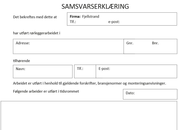 - Samsvarserklæring (Bekreftelse på at Rørentreprenørenes bransjeregler er fulgt)