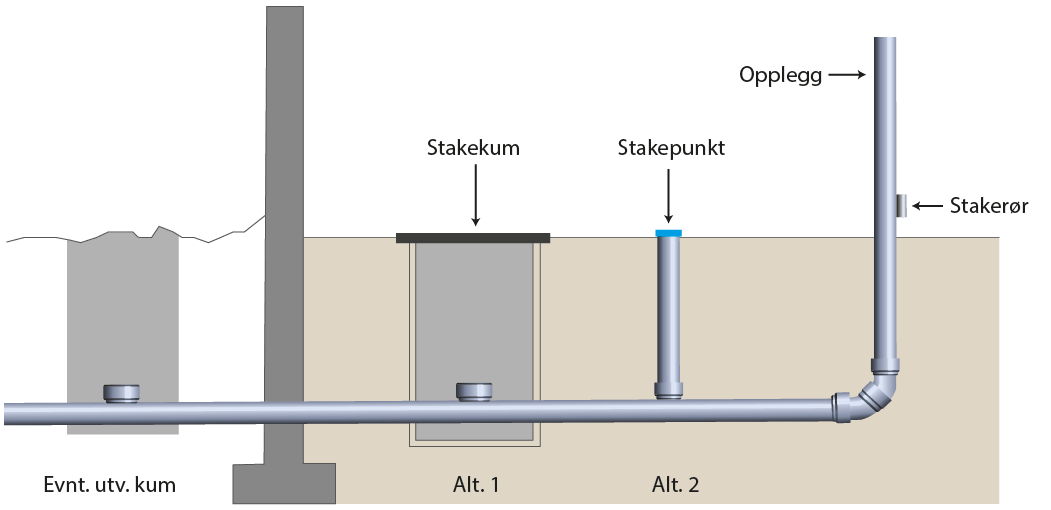 - Som stakepunkt kan benyttes 45° grenrør med ters med gjengelokk i gulvnivå.