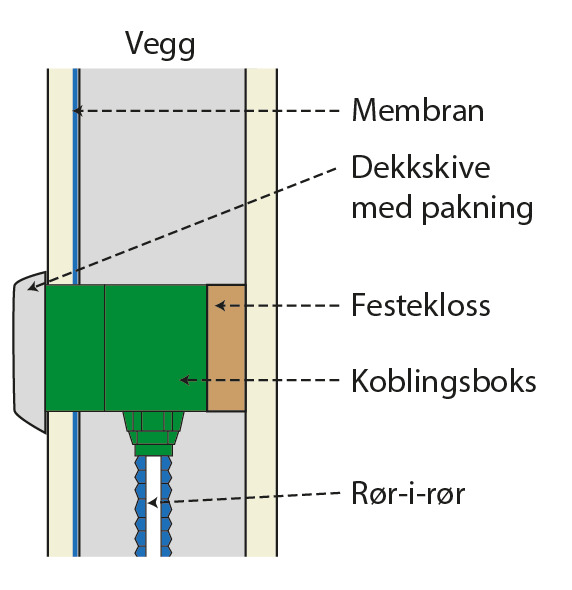 Byggebransjens Våtromsnorm har forslag til hvordan gjennomføringer skal gjøres i vegger i våtrom.