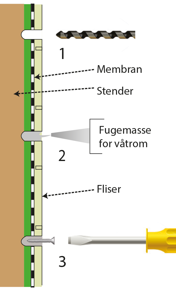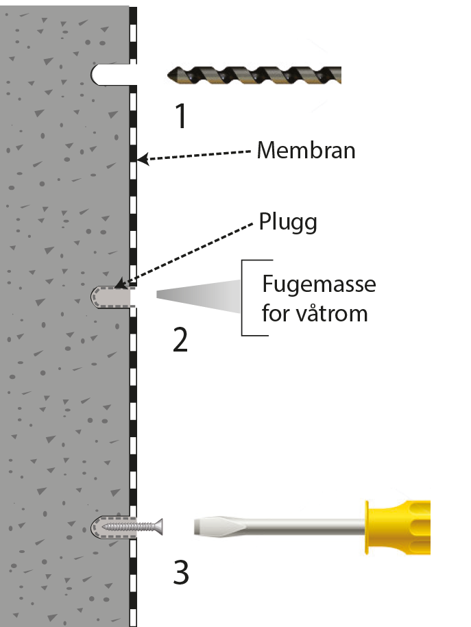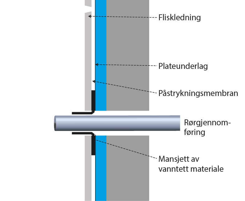 Flislagte vegger har som regel en smøremembran som tettesjikt. For å få en tett gjennomføring, skal: