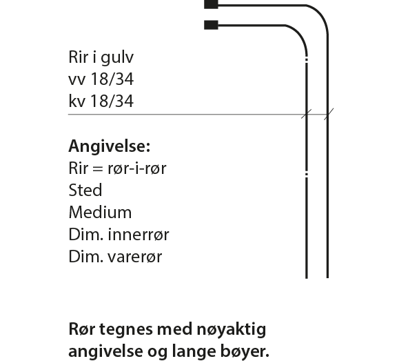 Rørstrekkene tegnes rett med lange bøyer i retningsendringene.