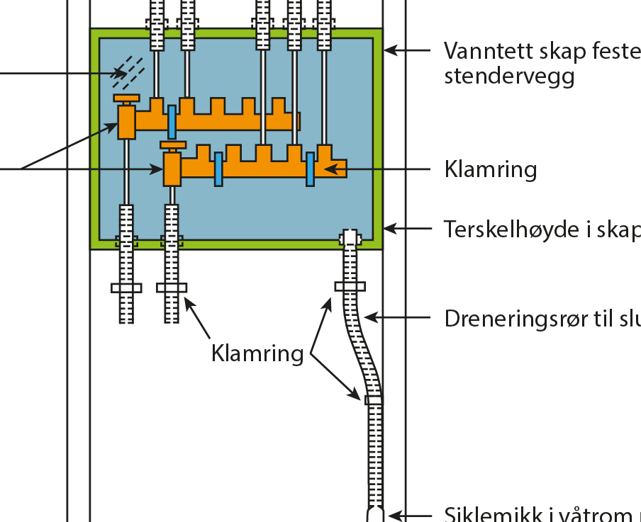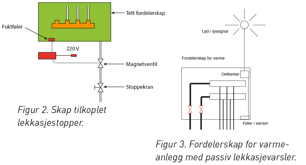 Fordelerskapet er en del av installasjonen, og skal altså sikres mot lekkasje. Skal varmefordelerskapet sikres på samme måte som sanitærfordelerskapene? Skal varmefordelerskapet ha overløp til sluk? Hvis dette ikke lar seg gjøre, må skapet utstyres med føler og magnetventiler på tur- og returledningene?