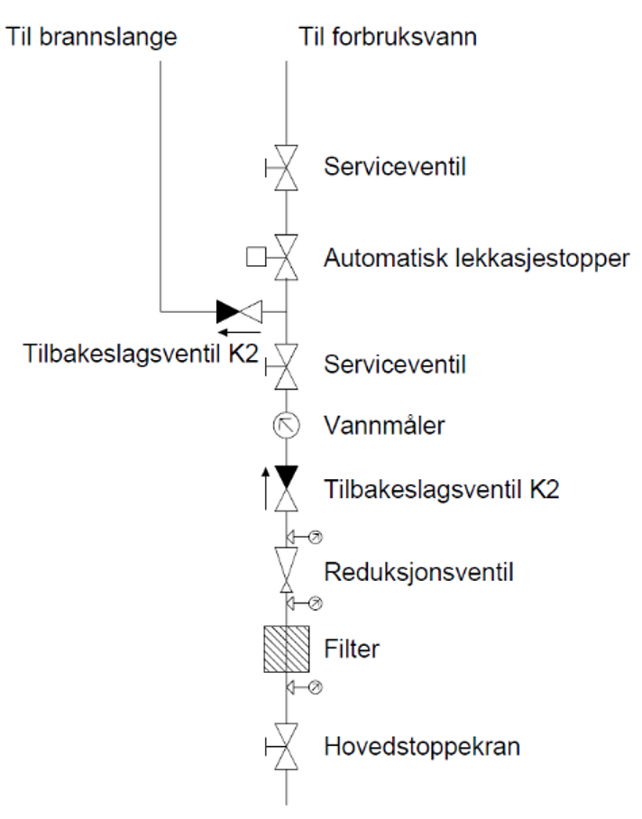 - Automatisk lekkasjestopper (anbefales å montere ved vanninntaket for å kunne dekke mer av boligen. Må monteres etter uttak for boligsprinkler og eventuelt brannslange)