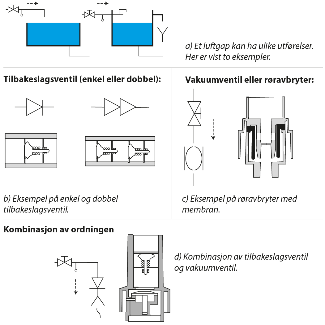 Der hvor det ikke er mulig å oppnå luftgap, skal det installeres en annen beskyttelse mot tilbakesuging eller tilbakestrømming av forurenset vann: