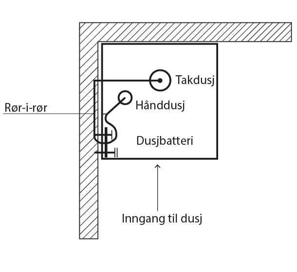 Det er ingen regler for hvor dusjbatteriet bør plasseres. Det overlates til arkitekt og prosjekterende i samråd med byggherre. Ofte blir batteriet plassert innerst i dusjen, rett under selve dusjen. Plasseringen skaper irritasjon fordi vannet treffer deler av kroppen før vannet har fått rett temperatur. I verste fall kan en ugunstig plassering føre til skålding (se 910.09). Batteriet med regulering av mengde og temperatur bør derfor plasseres ved inngangen til dusjen, se figur 4.