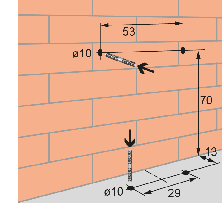I murvegg og gulv benyttes minst 10 mm ekspansjonsbolter tilpasset murens/gulvets beskaffenhet.