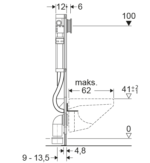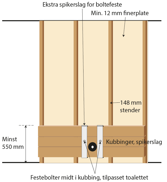 Stenderverket bør være minst 96 mm (4”). Dette er som regel ikke noe problem da veggen også skal ha plass til avløpet fra toalettet. Dersom det ikke er plass til 48 mm kubbinger (ved rehabilitering der avløpet føres gjennom veggen) skal det benyttes solide plater på hver side av veggen og brukes gjennomgående bolter med solide skiver. Stendere bør plasseres på hver side av boltene.