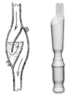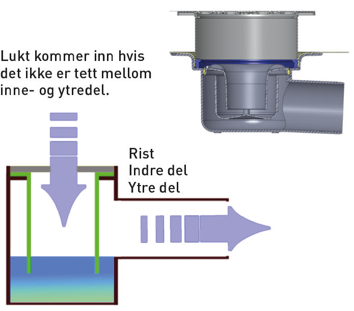 Figur 1. Moderne sluk (Purus Joti). Så lenge det fylles vann, og så lenge vannet ikke fordamper (i nederste del), slik at vannstanden kommer under den indre delen, så skal det ikke komme noe lukt inn fra avløpsrørene.