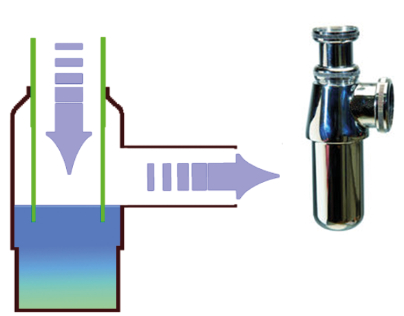 Avløp som føres direkte til spillvannsledning (utenom sluk) skal ha vannlås. Som regel benyttes en form for ”flaskevannlås”. Prinsippet er vist i Figur 2.