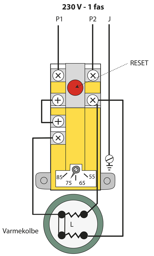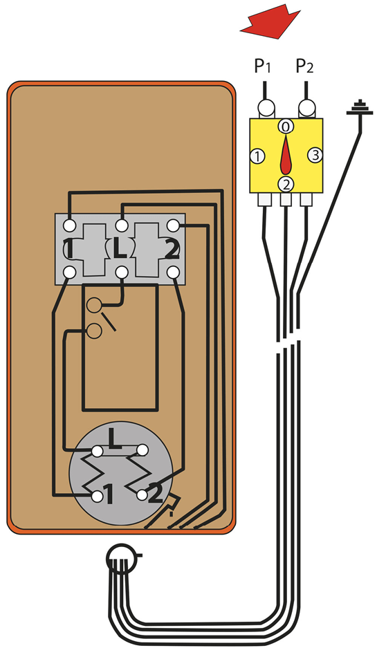 Måling med ohm-meteret foretas mellom P1 og P2.