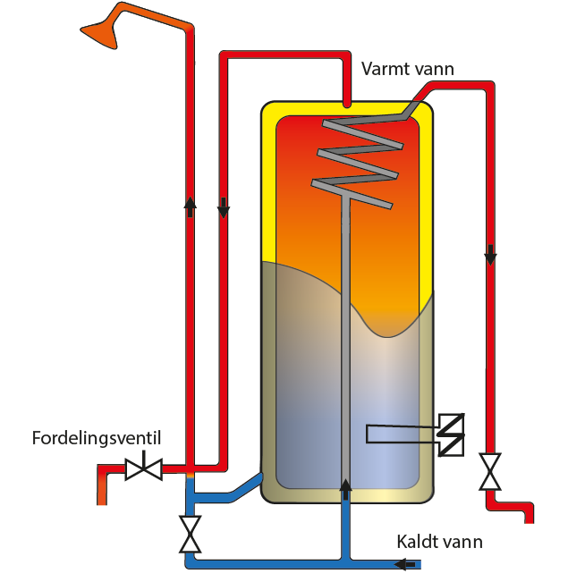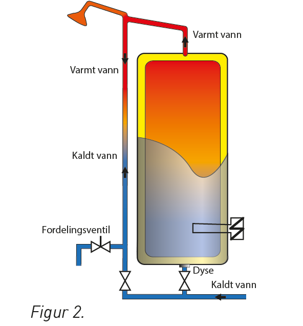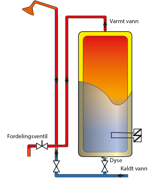 En flottørventil slipper kaldt vann inn i sisternen. Varmtvannstrykket blir lik høyden fra vannstanden i flottørkassa til tappestedet.