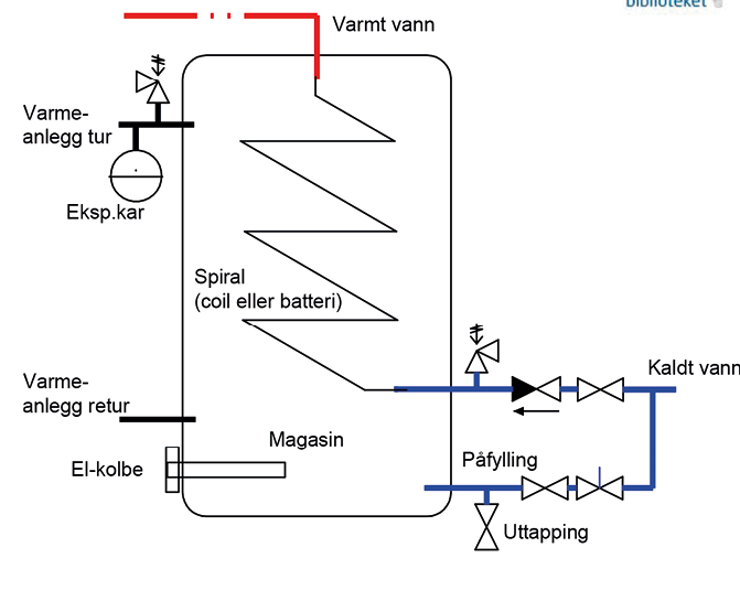 Innløpet til spiralen skal ha stengeventil, tilbakeslagsventil og sikkerhetsventil (9 bar). På det lukkede ekspansjonssystemet monteres sikkerhetsventil tilpasset driftstrykket. Gamle batteriberedere, konstruert for åpen ekspansjon, kan være for svake til å tåle skifting til lukket ekspansjonskar med ”normalt” driftstrykk. Husk å sjekke dette ved utskifting av ekspansjonssystem.