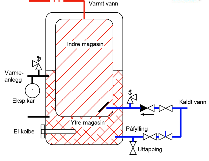 Det ytre magasinet kan ha åpen eller lukket ekspansjon. Lukket ekspansjonsanlegg sikres med en sikkerhetsventil, men kan også være tilkoplet kjelanleggets ekspansjonssystem, se side 325.31. Det ytre magasinet har ”dødt vann” det vil si oksygenfattig vann.
