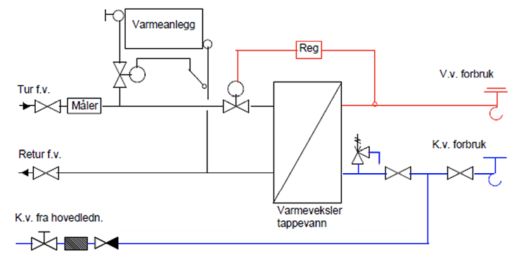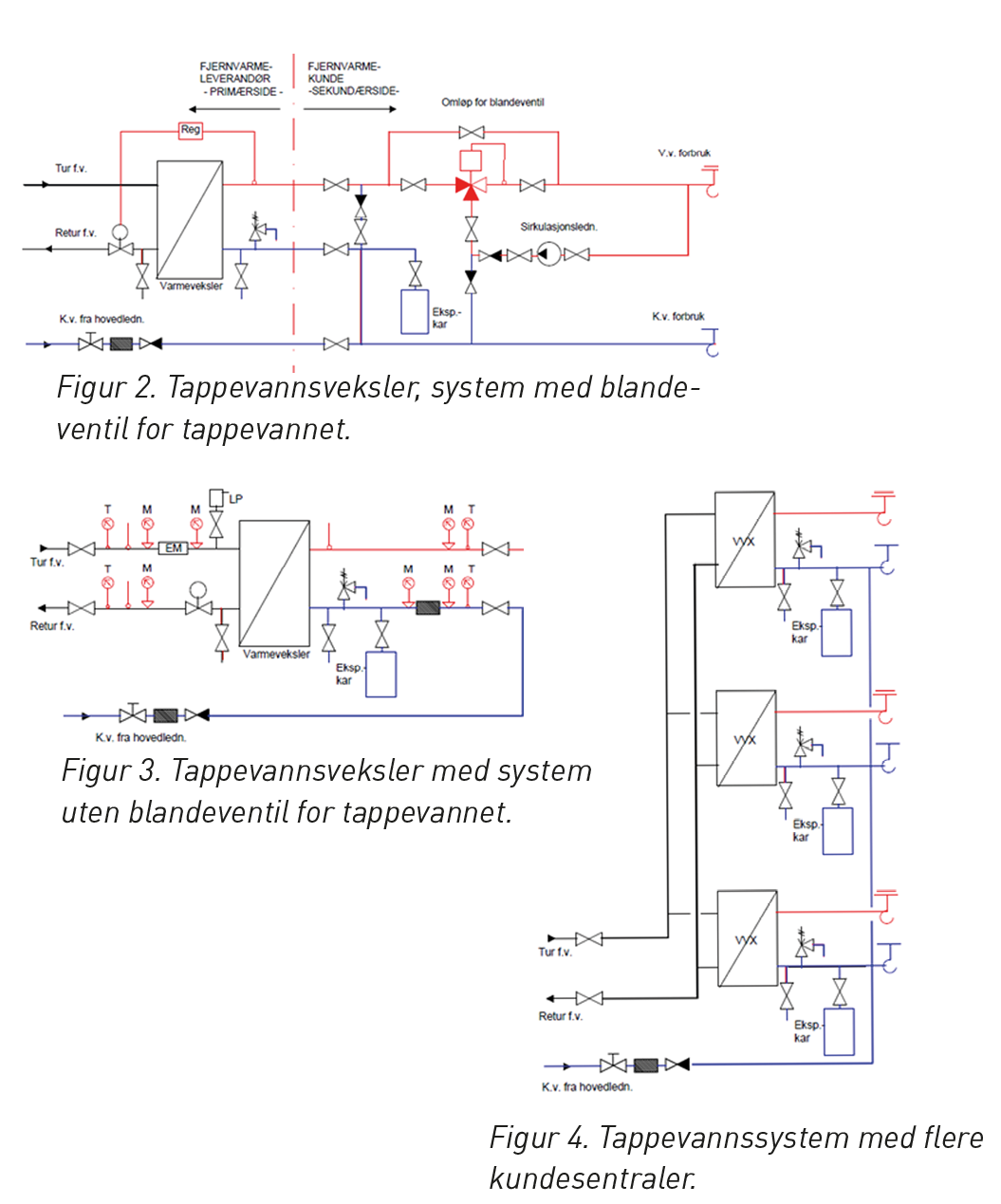 Uansett om det velges direkte eller indirekte prinsipp for fjernvarmesystemet, må tappevannsoppvarmingen skje via veksler eller batteribereder tilkoplet fjernvarmeanlegget.
