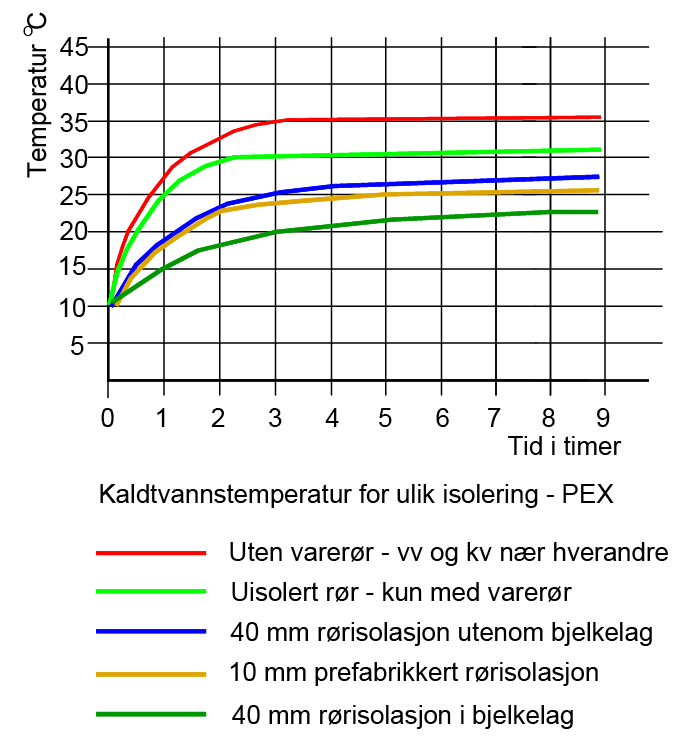 Svenske målinger og analyser viser at varmeoverføringer fra varmt tappevann og varmeledninger til kaldtvannsledninger er større enn antatt. I de utførte forsøkene ble kaldtvannstemperaturen definert til 24 °C (litt over romtemperatur). Figuren viser en typisk økning i kaldtvannstemperaturen når røret ligger nær et varmtvannsrør: