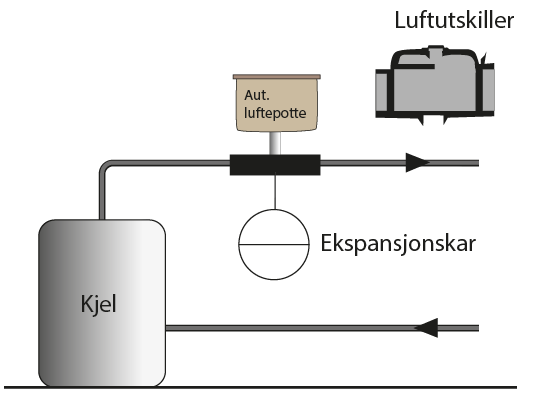 Monteres på toppunkter på turledningen rett etter varmekilden, kombinert med aut. luftepotte: