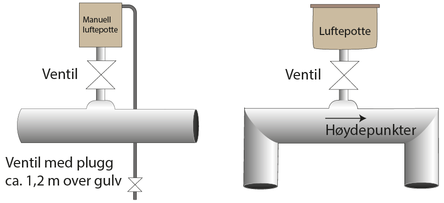 - Luft er lettere enn vann og vil derfor stige mot toppunktene i rørnettet og ellers i anlegget.