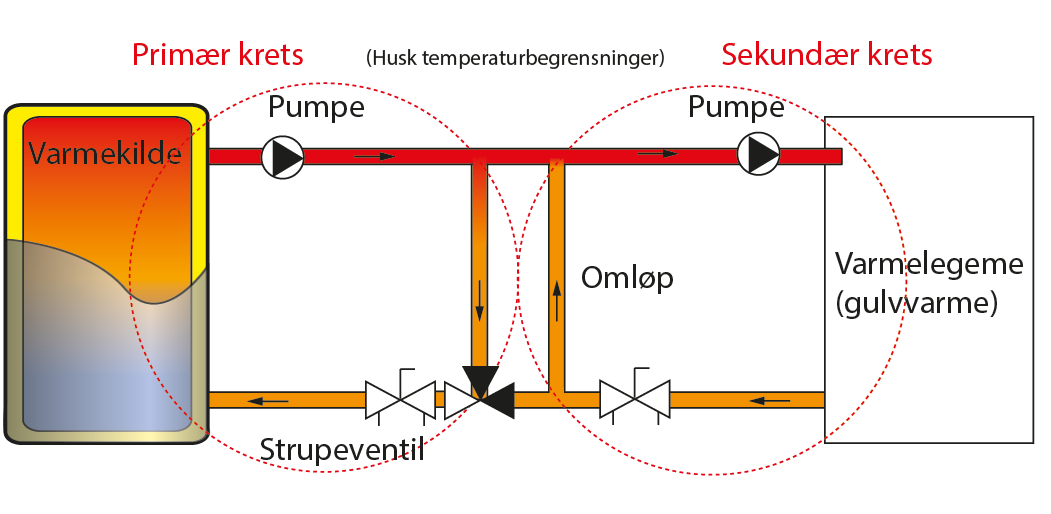 - Primærkretsen (kjelkretsen) og sekundærkretsen (varmelegemekretsen) virker uavhengig av hverandre. I hver av kretsene monteres strupeventiler for riktig regulering av vannmengdene.