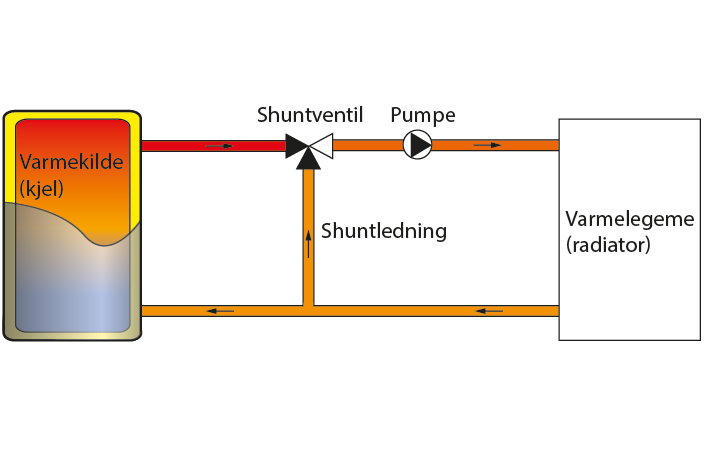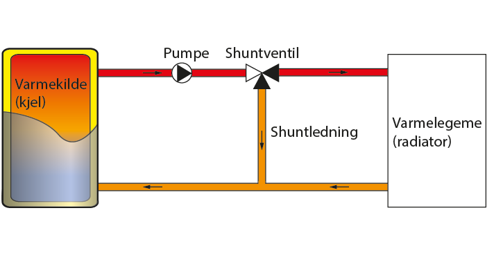 Turtemperaturen er konstant til varmelegemet (radiatoren/varmebatteriet e.l.), men vannmengden reguleres gjennom shunten.
