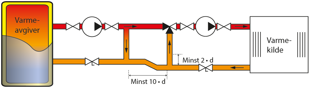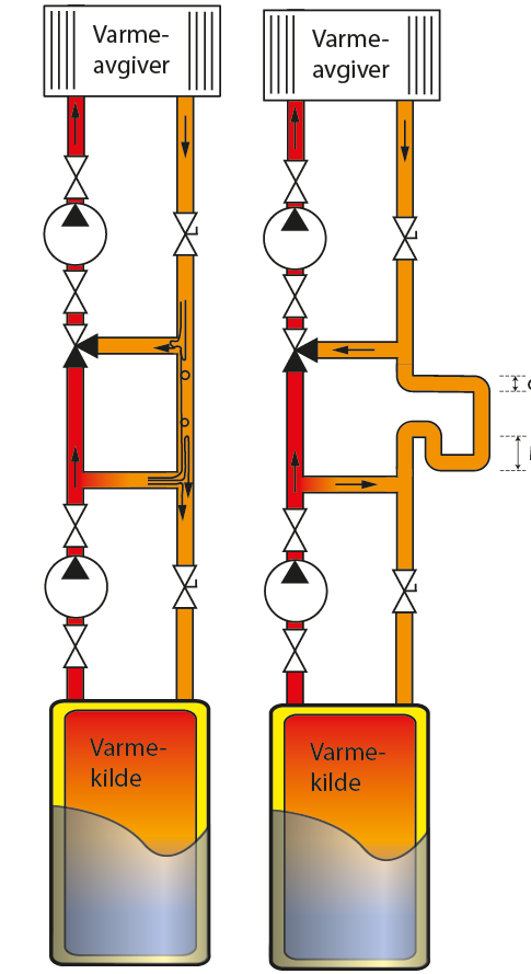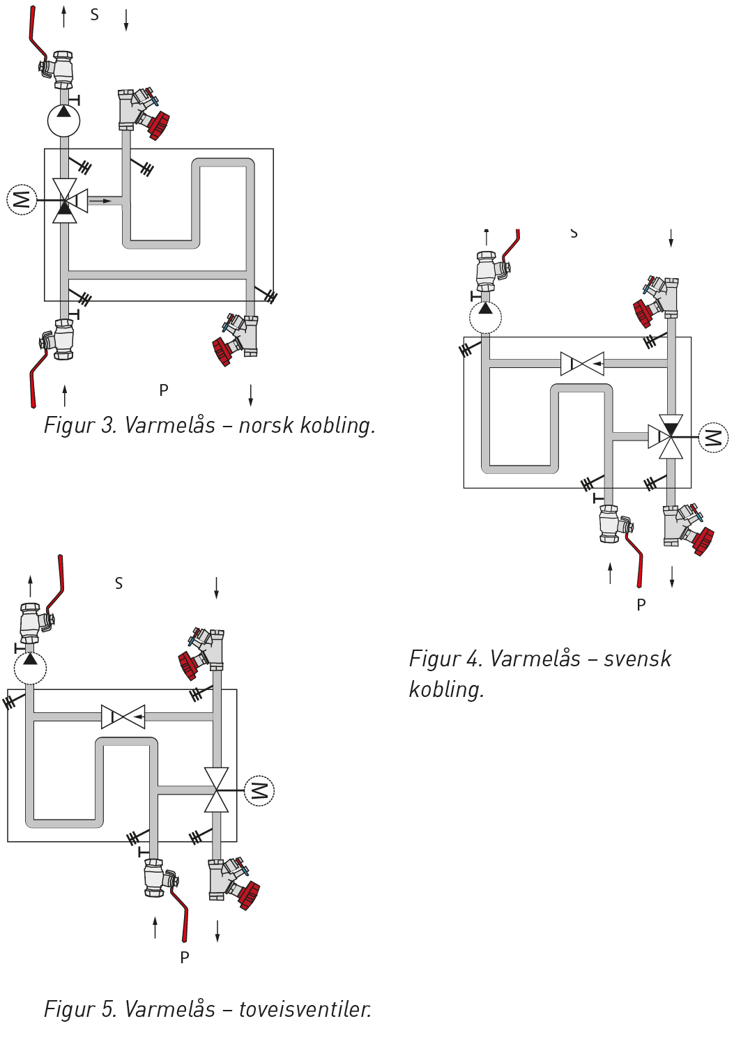 Uønsket dobbeltsirkulasjon kan også skje i horisontale rør. Det er derfor nødvendig å lage varmelåser også ved horisontale ventilkoblinger. Varmelåser kan utføres på ulike måter, slik figurene viser.
