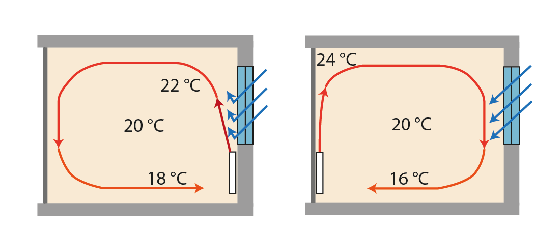 Varmeavgivelsen fra radiatoren skjer både ved stråling (20–30 %) og ved konveksjon (70–80 %). Mesteparten av varmen brer seg med luftstrømmen i rommet. Som regel velges derfor radiatorplassering under vinduer. Etter at vinduene er blitt så gode, er den kalde luften (”kaldraset”) fra vinduene ikke lenger så merkbar, og radiatorene kan derfor flyttes til andre steder. Husk å ta hensyn til innredning og huseiers ønsker når radiatorplasseringen skal planlegges.Radiatoren skal plasseres minst 10–15 cm fra gulv til bunnen på radiatoren for å oppnå best mulig sirkulasjon av luften.