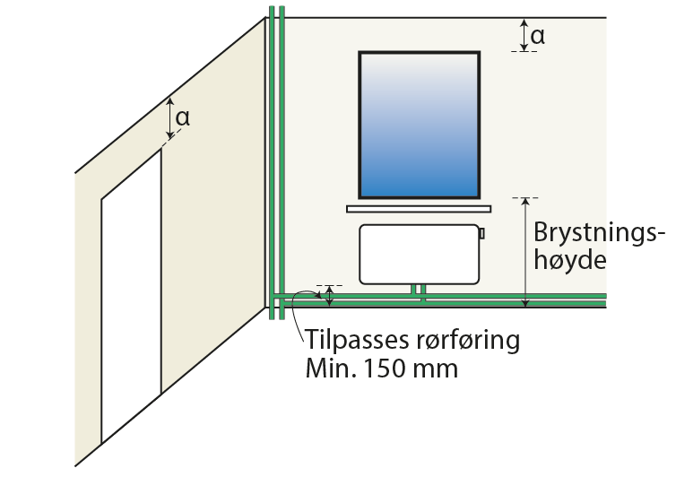 Dessuten skal det være mulig å gjøre rent under radiatoren. Ta også hensyn til brystningshøyde og vindusbredde for penest mulig plassering. Husk plass til eventuelt høye gulvlister og rørføringer under radiatoren.