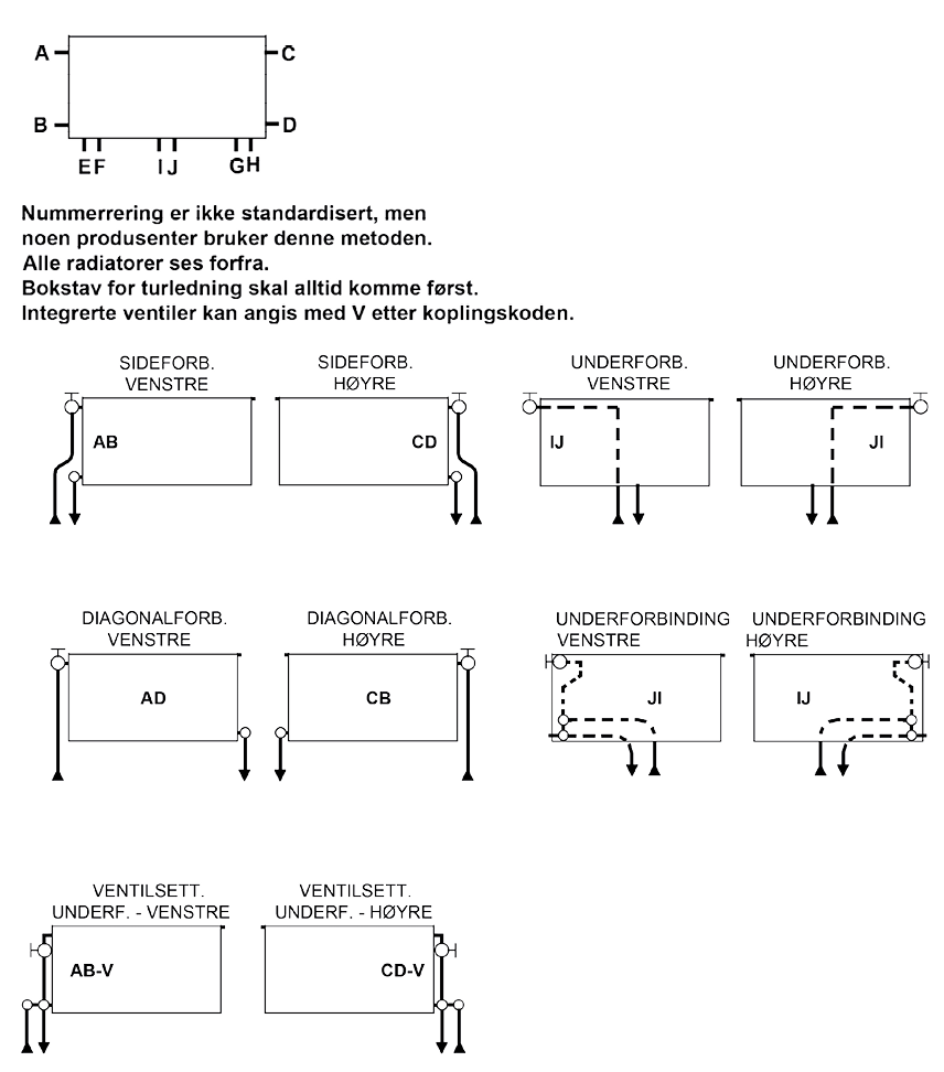 Radiatorene kan kobles til på sidene og under, med ulike alternativer som må spesifiseres ved bestillingen.