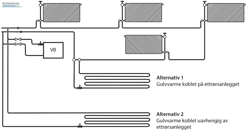 Figuren viser ettrørsanlegg for radiatorene og torørssystem til gulvvarme og varmebatteri.