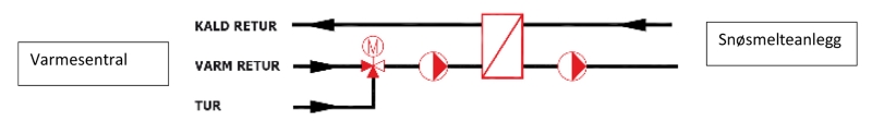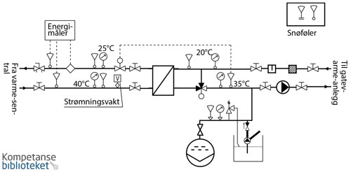 Som det fremgår av fig. 1 må et snøsmelteanlegg tilkoples en varmeveksler. Reguleringen skjer via en spesiell reguleringsentral med følere for temperatur (bakkefølere) og snøsensorer (sniffere). Snifferne registrerer fuktighet og raske temperatursvingninger som er en indikasjon på nedbør. Signalene fra følerne behandles i styringsenheten som starter/stopper pumpe og styring av motoren på shuntventilen. Styringsenheten kan også tilkoples andre frostutsatte områder som for eksempel matter rundt taksluk. Store anlegg har flere sensorer, montert på ulike soner av anlegget for å gjøre responstiden så kort som mulig.
