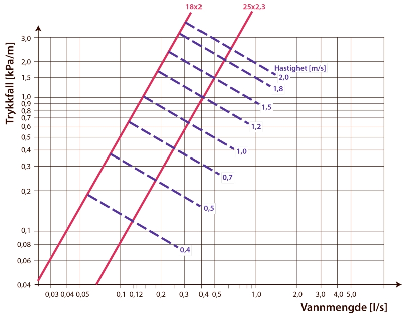 I tillegg kommer trykkfallet i ledningen fra varmeveksler til fordeler som må regnes ut på grunnlag av total vannmengde, 0,24 · 10 = 2,4 l/s og lengden av mateledningene (tur + retur).