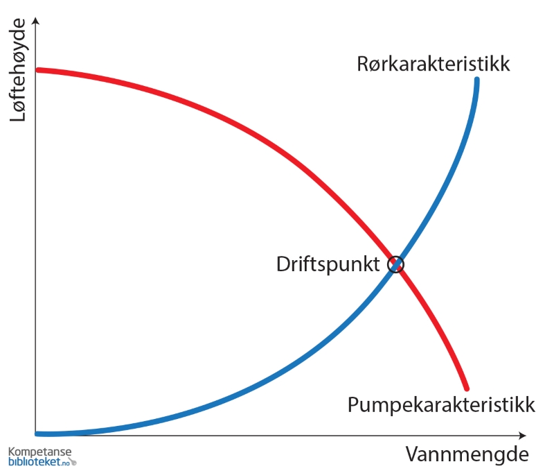 Pumpediagrammet viser dette. Der de to kurvene skjærer hverandre kalles pumpens driftspunkt.