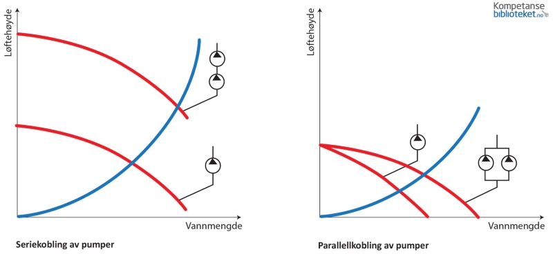 To pumper satt ved siden av hverandre (i parallell) gir tilnærmet samme trykk, men større vannmengde.
