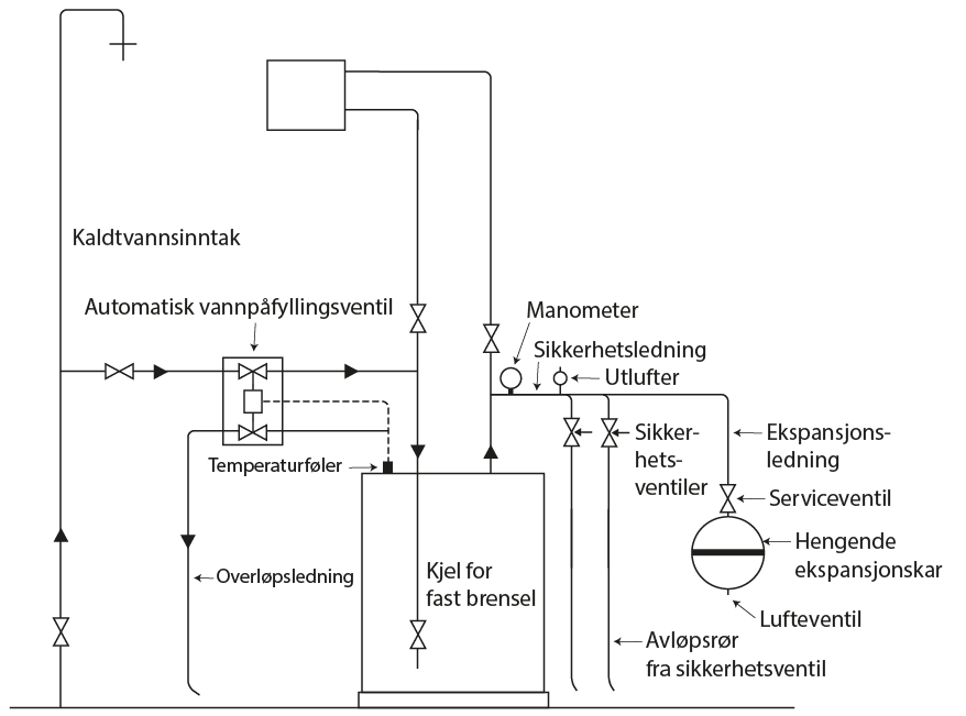 Monteres trykkekspansjonskar i anlegg med kjeler for fast brensel, skal anlegget utstyres med en automatisk vannpåfyllingsventil som styres av kjeltemperaturen.