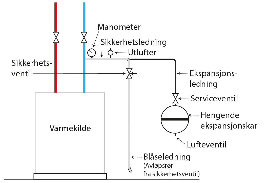 - Det skal aldri monteres stengeventil på sikkerhetsledningen.