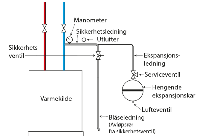 Alle anlegg med trykkekspansjonskar skal ha minst én sikkerhetsventil som plasseres så nær kjelen (varmekilden) som mulig.