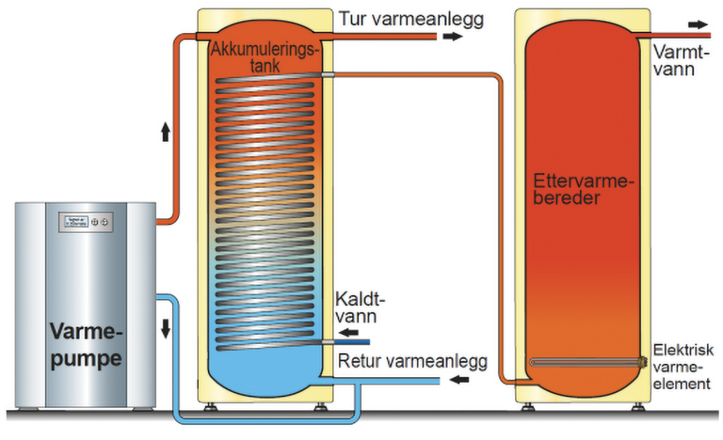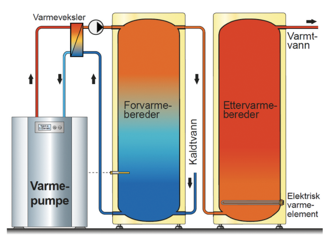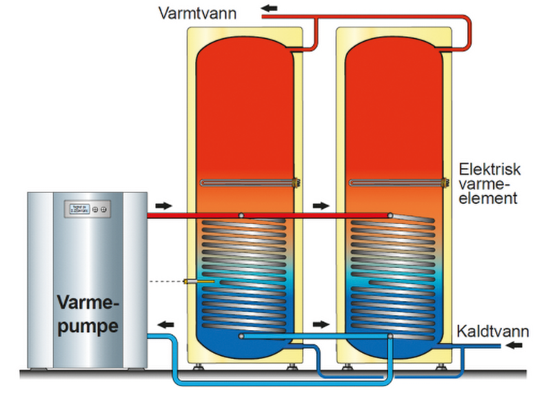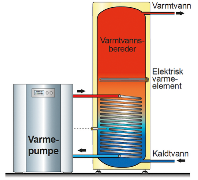Skal varmepumpa kun dekke varmtvannsforbruket, kan den tilkobles varmtvannsberederen slik Figur 1 viser. Denne berederen er delt opp i to temperatursoner. Nedre lavtemperatursone kun for varmepumpen, mens øvre blir ettervarmet med elektrisitet etter behov. Rørspiralens (coilens) overflate i varmtvannsberederen bør ikke være mindre enn 0,2 m2/kW ved laveste effekt.