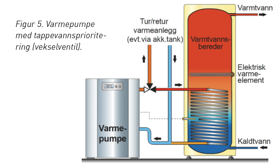 Vekselventilen kan være plassert på tur eller retur. Berederens coilstørrelse bør som tommelfingertall være minimum 0,2 m2 pr. kW varmepumpe. Dette gjelder av/på-regulerte varmepumper. Kapasitetsregulerte (f.eks. inverter) varmepumper kan vanligvis klare seg med mindre areal, og da gjelder tommelfingertallet for den effekten varmepumpen leverer ved tappevannsoppvarming. Dersom varmepumpen er for stor i forhold til coilstørrelse, kan den tilkobles tanksiden, mens det kalde tappevannet varmes opp i coilen. Alternativt kan plateveksler brukes for bedre varmeoverføring. Følg leverandørens anvisninger! I større anlegg som har flere varmepumper, kan for eksempel én av dem brukes også til tappevannsoppvarming (Figur 5).