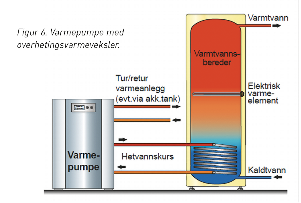 - Oppvarming av tappevann med overhetingsvarmeveksler, også kalt «varmepumpe med hetvannskurs», kan levere en andel (typisk 10–20 %) av sin effekt med høyere temperatur. Dette er en vanlig løsning for større varmepumper, og brukes når energibehovet til tappevannsoppvarming utgjør en mindre andel av energibehovet til romoppvarming. Det er viktig å presisere at varmepumpen er avhengig av å kunne levere varme til varmeanlegget for å kunne levere «hetvann». Det vil si at bygget må ha et romoppvarmingsbehov for å kunne varme tappevann. Er andelen av energibehovet til tappevannsoppvarming større, anbefales det å kombinere med tappevannsprioritering som beskrevet over i pkt. 2. Se Figur 6.