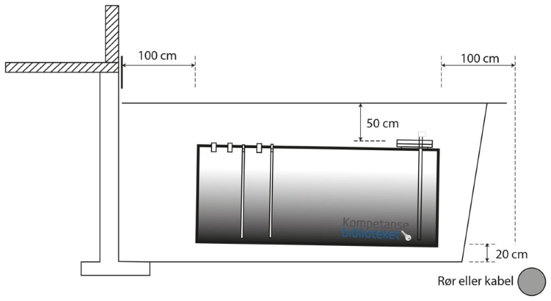 Nedgravde oljetanker skal plasseres minst 1 meter fra bygg, rørledninger og kabler og minst 60 cm fra andre tanker.