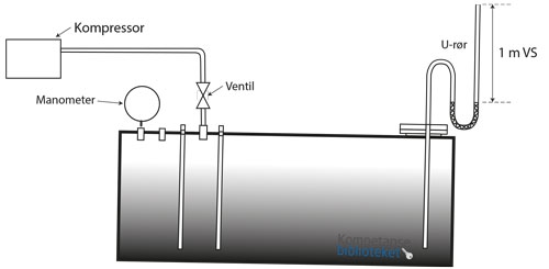 Bruk riktig gradert manometer og et væskefylt U-rør ved tetthetsprøvingen. U-røret skal ha minst like stor diameter som ledningen fra kompressoren. På ledningen fra kompressoren monteres stengeventil.