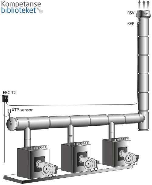 Sammenkobling av flere oljekjeller med røykgassvifte.