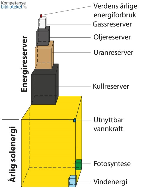 Figuren viser hvor mye solenergi (gul kube) og andre energislag som er tilgjengelig i forhold til energiforbruket (den øverste kuben).