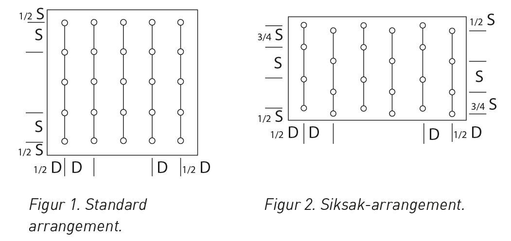 *Merk; siden det er angitt et største dekningsareal for hver enkelt sprinkler, kan ikke et sprinklerhode plasseres med største innbyrdes avstand i alle retninger. Hvis et sprinklerhode hadde hatt 4 meter avstand (OH-anlegg) til nærmeste sprinklerhode i både S-retning og D-retning i et standard arrangement, hadde dekningsområde for denne sprinkleren blitt 4*4 = 16 m2. Det er 4 m2 mer enn tillatt.