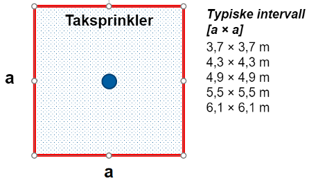 - Største dekningsområde og avstand mellom sprinklerhoder styres i hovedsak av dekningsområder gitt i produsentenes datablad. På figurene under kan man se typiske intervaller for dekningsområder for taksprinkler og veggsprinkler (hvilket intervall som velges i prosjekteringen avhenger blant annet av tilgjengelig trykk):