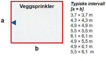 - Iht. NS-EN 12845 er største kastelengde for et veggsprinklerhode 3,7 meter. Er rommet dypere enn dette må man enten ha en rekke med veggsprinkler på hver side av rommet eller supplere med taksprinklerhoder. Detaljer rundt dette kan leses i tabell 20 under punkt 12.2 i NS-EN 12845.