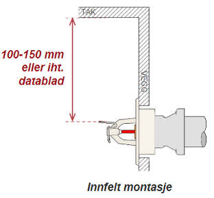 *Merk; standarden åpner for å øke maks avstand fra deflektorplate til tak, til 0,3 m under brennbare tak eller 0,45 m under ubrennbare tak. Disse maksimumsavstandene skal kun brukes der det foreligger en vurdering som viser at dette er nødvendig. Arealet som berøres skal være minst mulig.