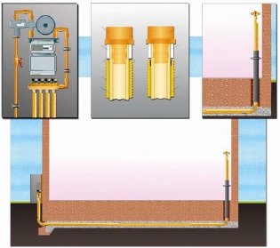 - Fra fordeleren kan gassrørene legges skjult i et sandlag under kjellergulvet. Rørene skal da være etter rør-i-rør-prinsippet.