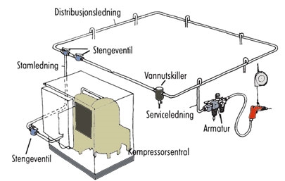 - Distribusjonsledning - fører luften frem til aktuell arbeidsplass - som regel utført som ringledning for å sikre stabile trykkforhold
